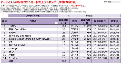 miwaは2010年に「don't cry anymore」でメジャーデビューした女性シンガーソングライター。すぐにブレイクを果たし、2010年代に渡りヒット曲を大量輩出した。日本レコード協会によれば、これまでにダウンロード売上10万以上を記録した曲は12曲で、認定総ダウ…