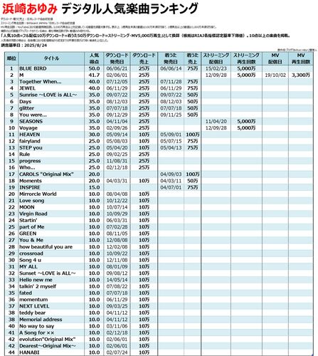 浜崎あゆみは1998年に「poker face」でデビューした女性ソロアーティスト。デビュー後すぐにブレイクし、以降10年以上に渡りヒット曲を大量輩出した。 浜崎あゆみは活躍期間が長く、その間音楽業界もダイナミックな変化を複数回遂げているため、楽曲人気を計…